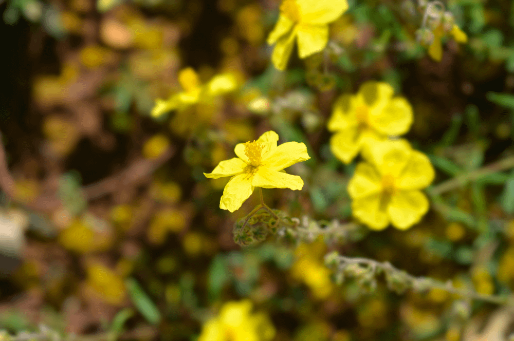L’Hélianthème est un sous arbrisseau vivace de la famille des Cistaceae, originaire d’Europe. Sa floraison en Juin à Septembre donne des fleurs jaunes.