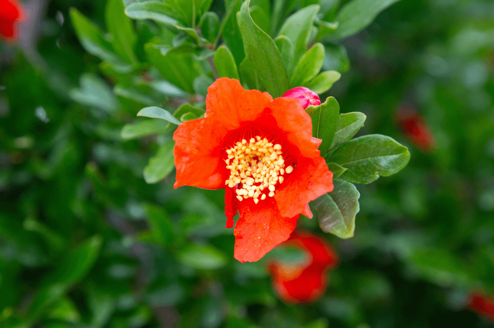 Le Grenadier commun est un arbuste rustique de la famille des Punicaceae, originaire d’Inde. Sa floraison de Mai à Septembre donne des fleurs rouges.
